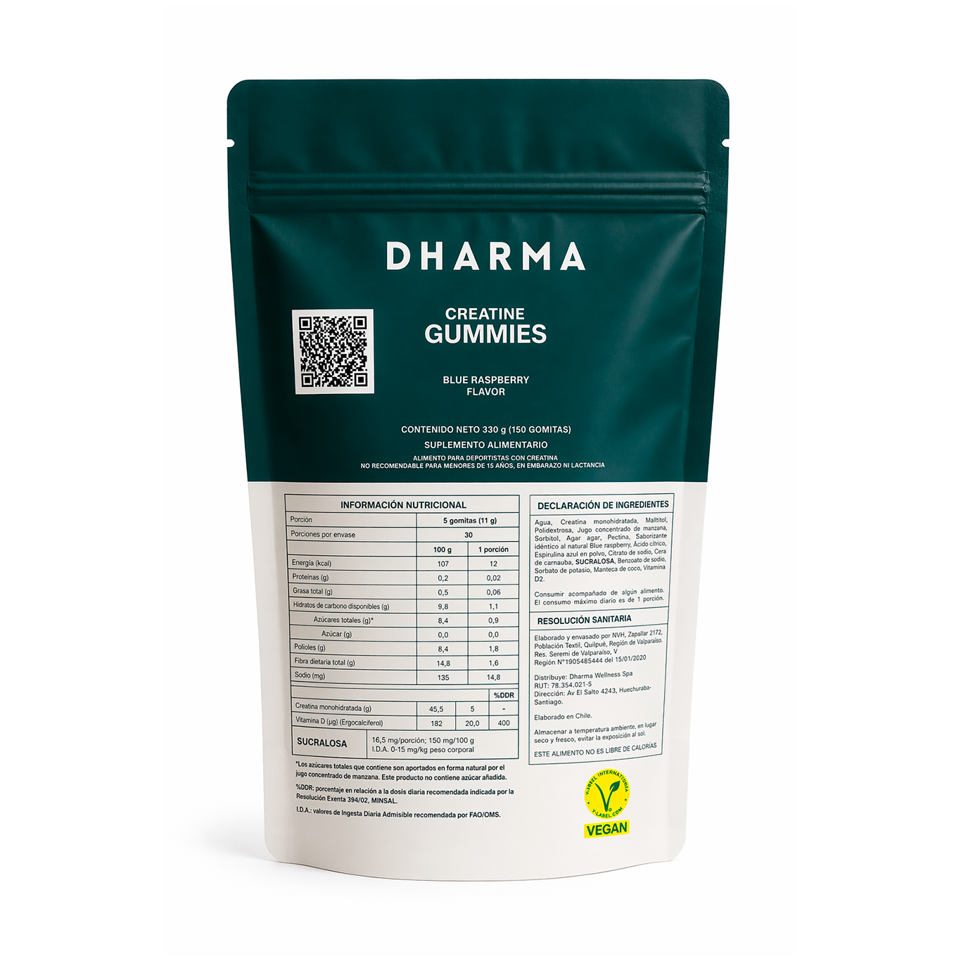 Creatine Gummies Dharma sabor Blue Raspberry en formato práctico y delicioso. Cada porción aporta 5g de creatina monohidratada, ideal para mejorar el rendimiento físico. Producto vegano, sin gluten y sin azúcar añadida.